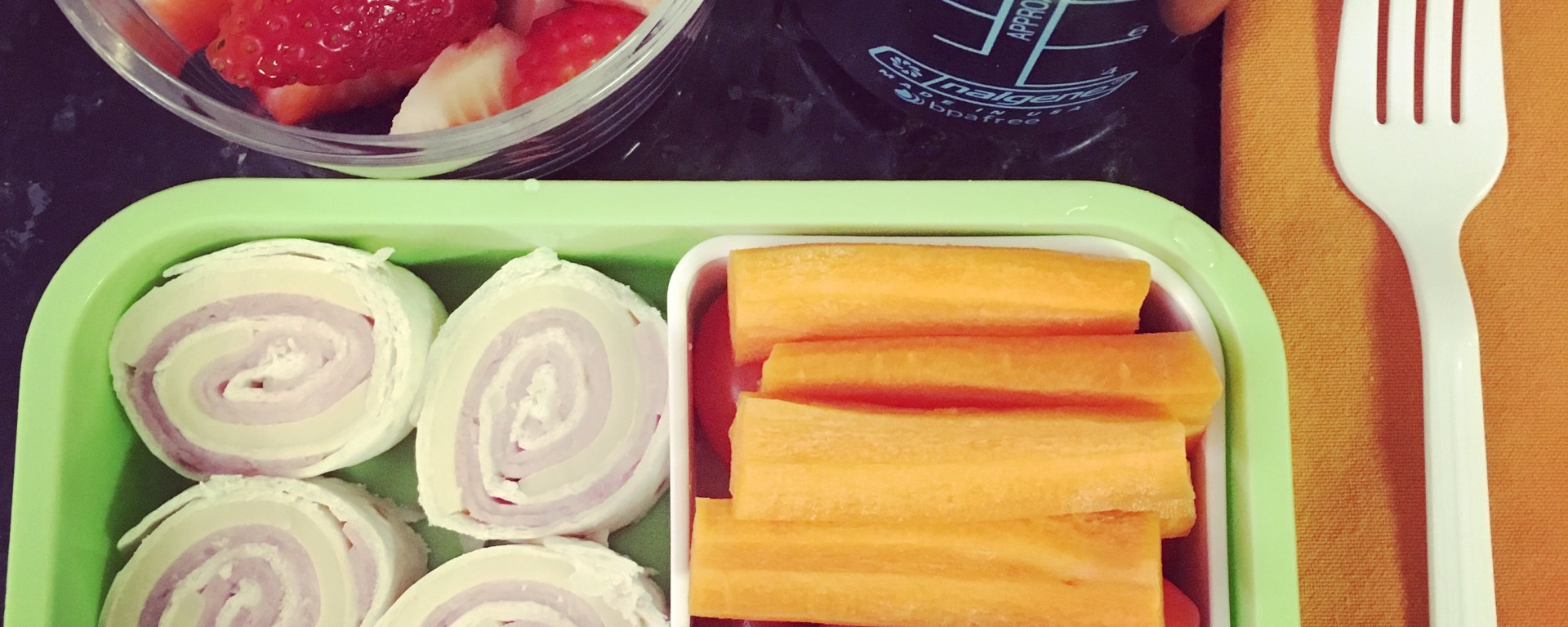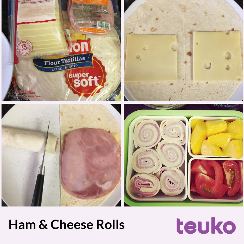 For 6 little rolls (perfect for one lunchbox) you just need: 1 flour tortilla, 2 slices of cheese, 2 slices of ham.