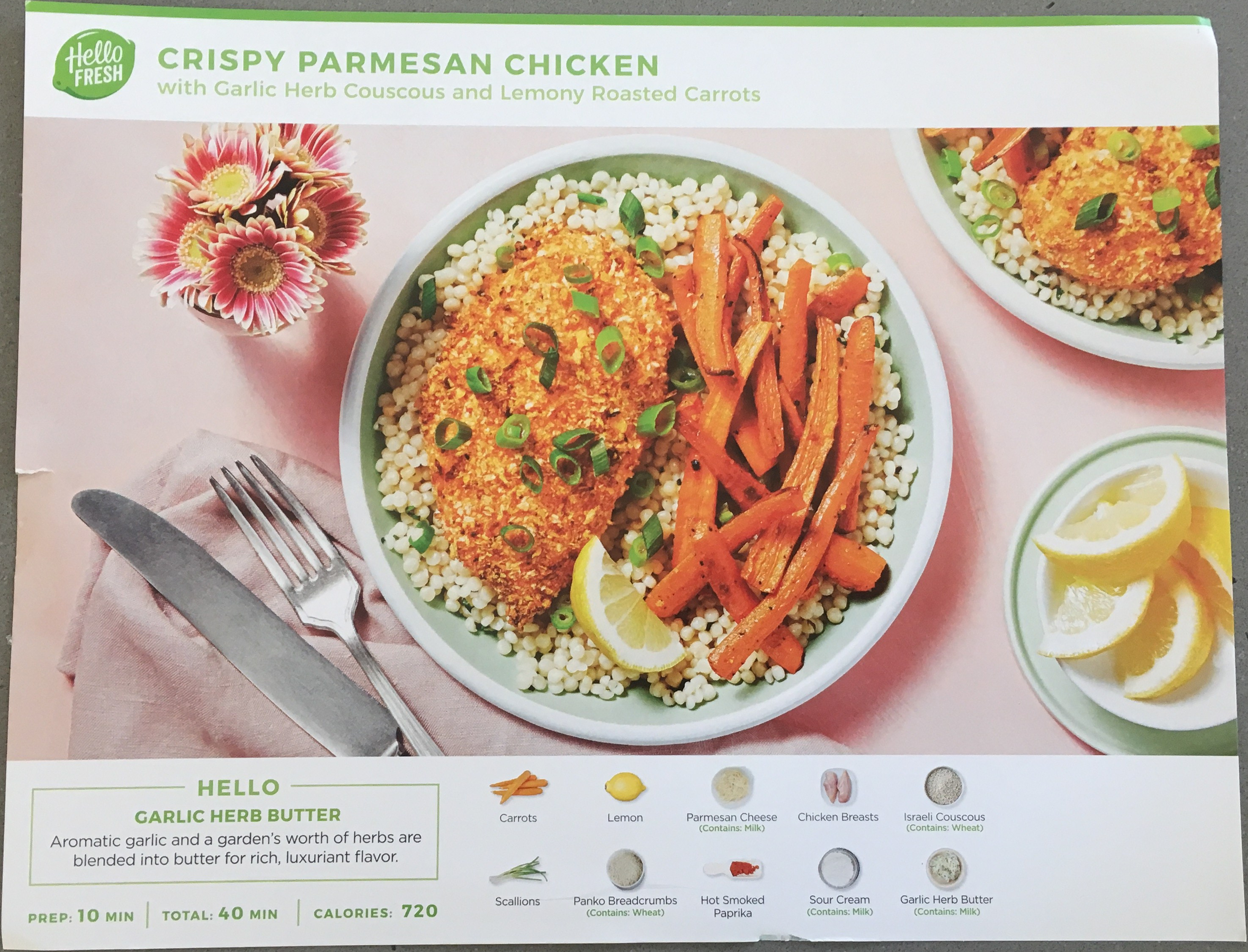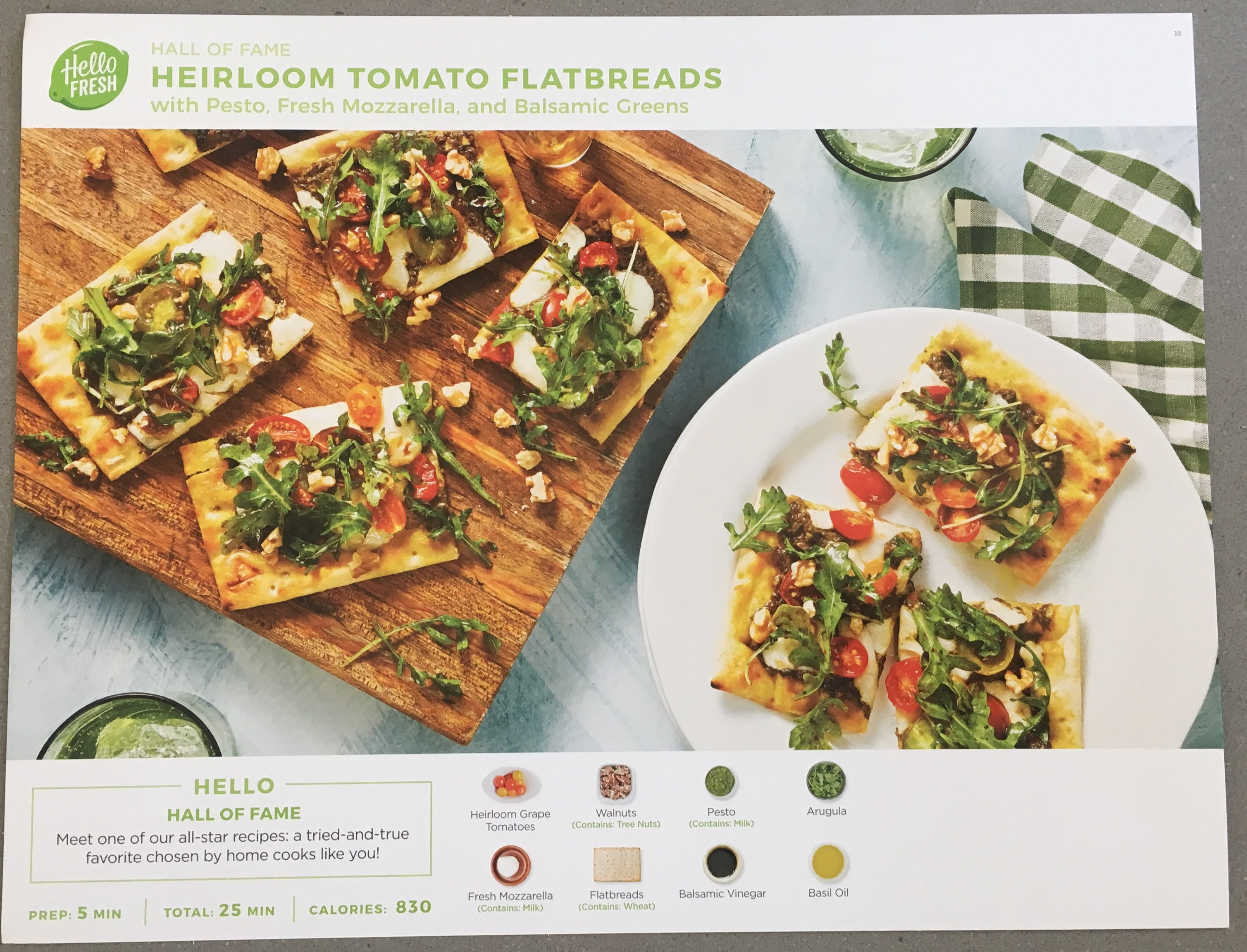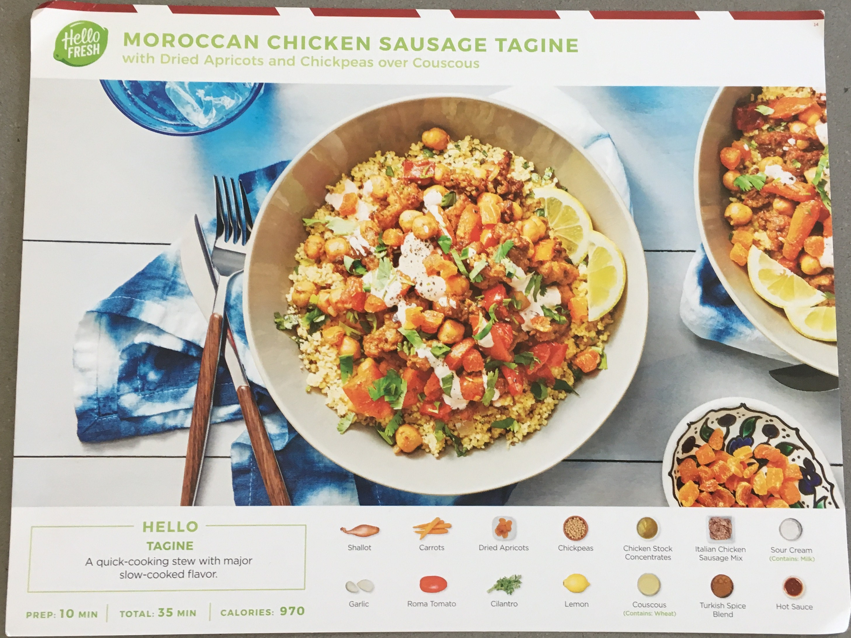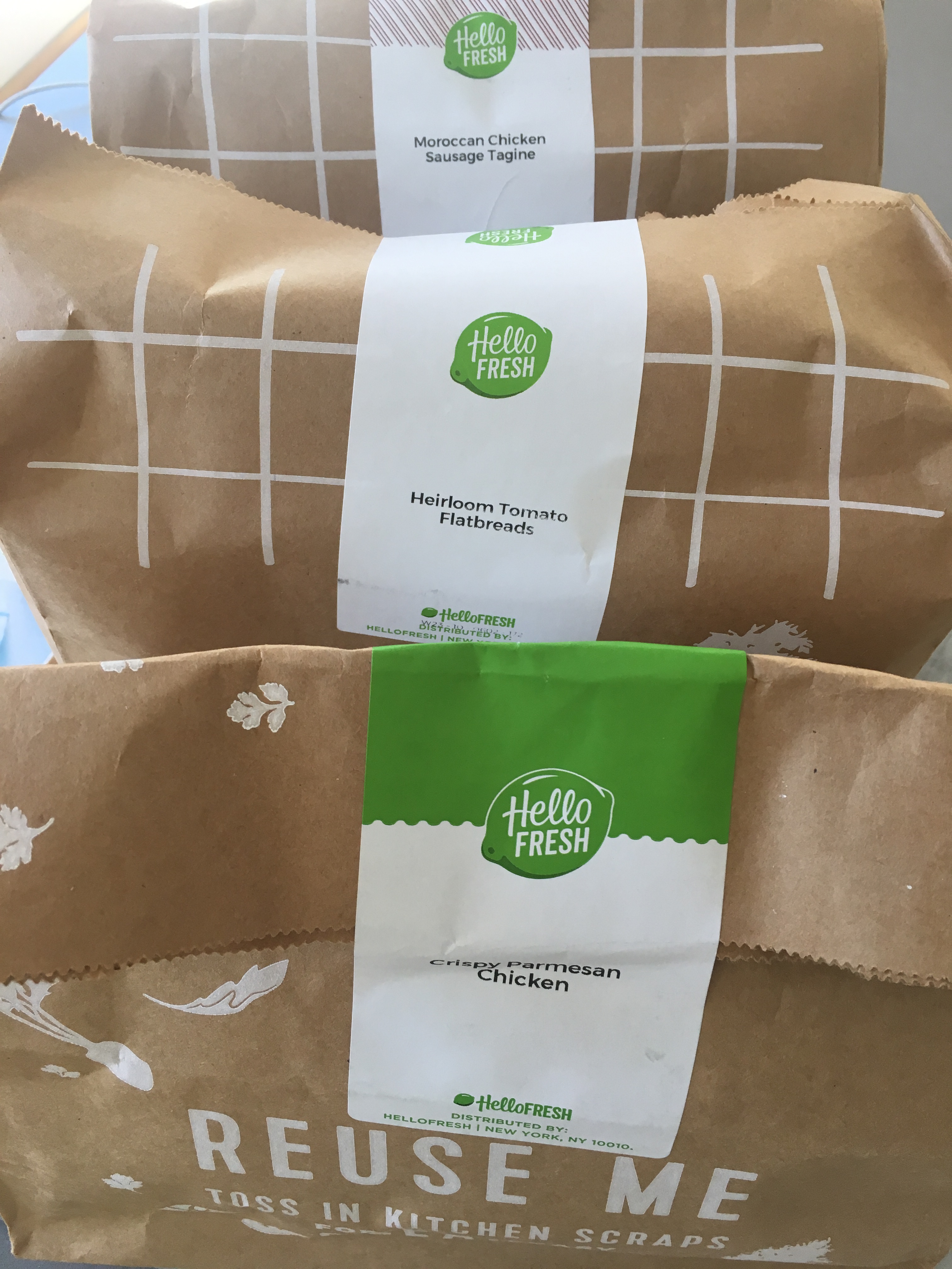 We opened and discovered our three meal kits: “Heirloom tomato flatbreads”, “Moroccan chicken sausage tagine”, and “Crispy Parmesan chicken”.