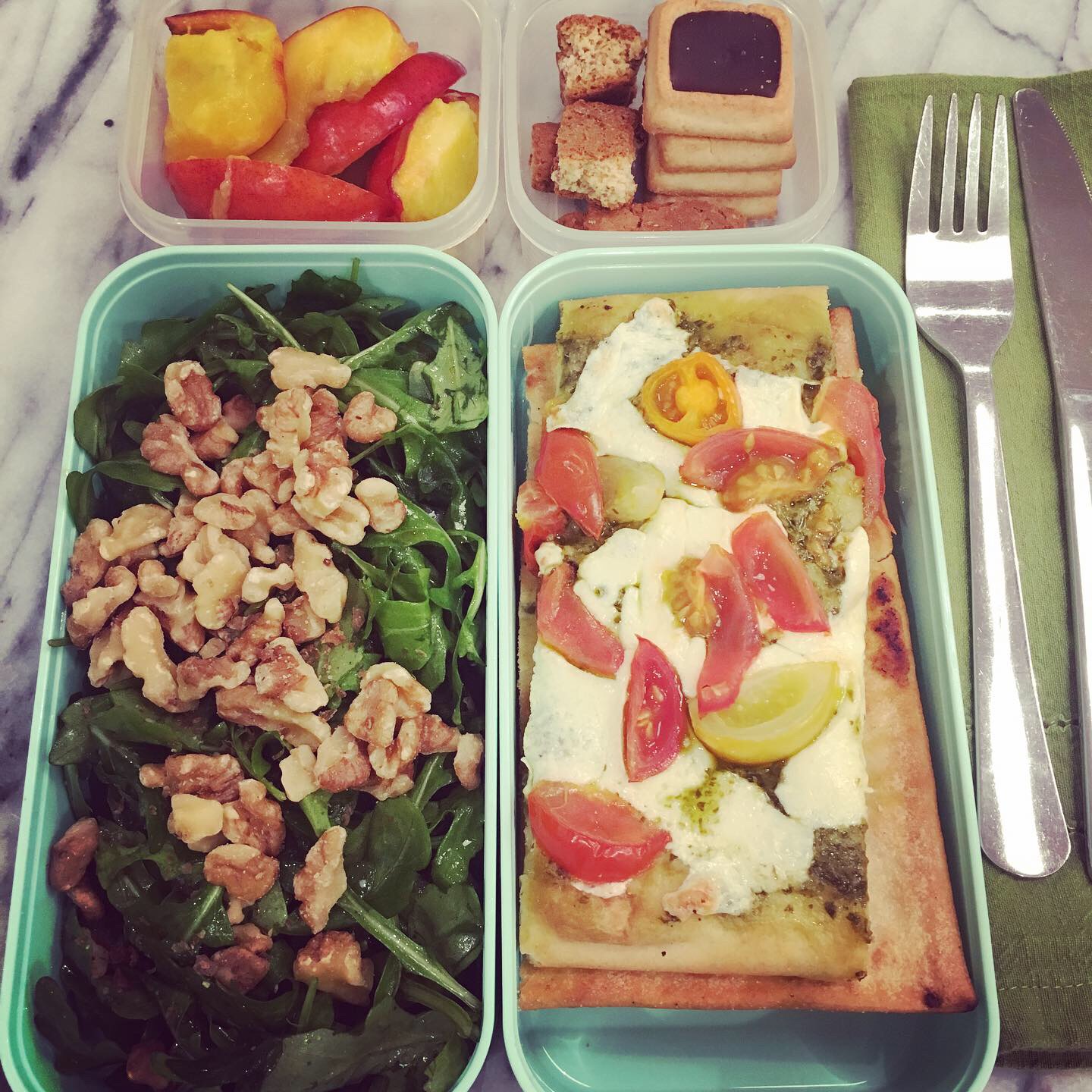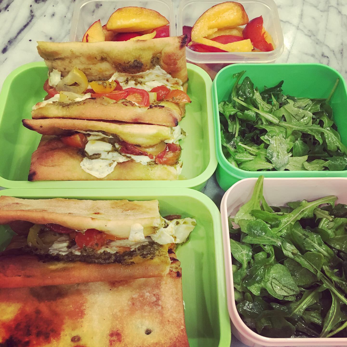 For the very first day, I decided to go easy, with the “Heirloom tomato flatbreads”. To make it easier for the little hands, and because it had to fit in the lunch boxes, I cut the flatbreads and folded them. The tomatoes were suggested to be cut in a half, but I sliced them so that it would be more convenient to eat for little mouthes. The arugula salad was supposed to top the flatbread but my kids are not adventurous enough to mix. So I let the salad on the side for everybody, dressed as advised by the instructions, with a mix of olive oil and Balsamic vinegar. We all loved it like this. I just added a nectarine for dessert, and voilà! Lunch was ready.