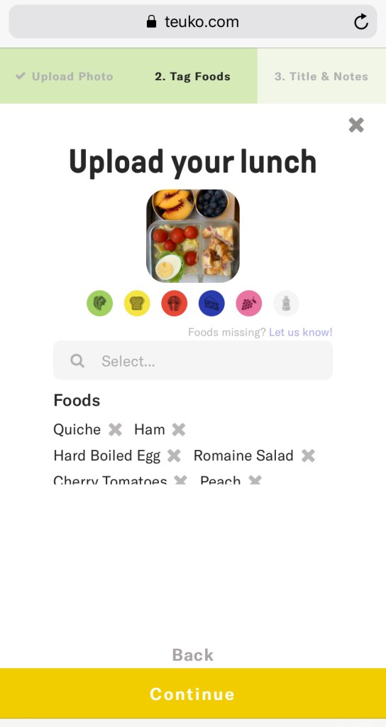 Step 2 – Tag the main food items you used to better retrieve and reuse your ideas later. Teuko will help you get a better awareness of what you pack by showing which one of the 5 food groups are included in your food tags.