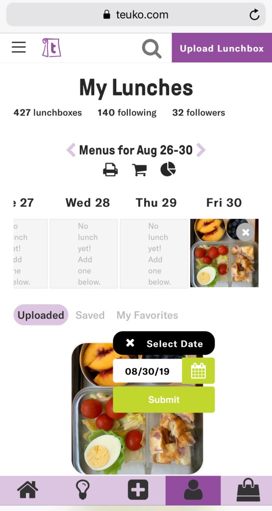 Step 4 – Select a date Select a date for every lunchbox idea you’ve uploaded to send it to your personal calendar. This step is optional but it will allow you to go back to your history by week and date, make meal plans, edit grocery lists, and get foodie statistics!