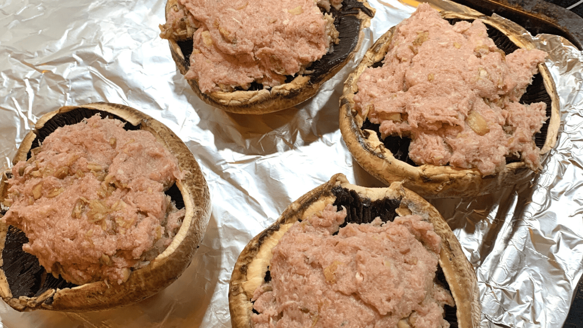 Mix all the ingredients together. Veggies we love stuffed : mushrooms, tomatoes, potatoes, zucchinis.
