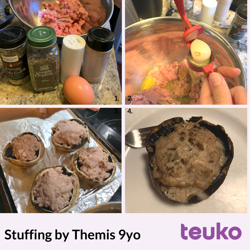 Themis is 9yo. She is sharing a stuffing recipe from her grandma, who delights the family with stuffed tomatoes every summer in the South of France. It’s easy to make, and what we like about it is that it makes any veggie so appetizing!