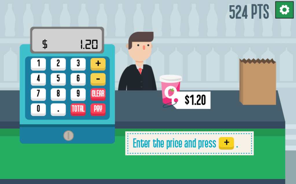 Almost like a real grocery cashier at the supermarket, kids will be familiarized with addition and making change on cash purchases. Shoppers can use gift certificates or cash to pay. If the gift certificate is larger than the order amount no change is given while change is given for cash payments above the order amount. Players must make change by clicking on bills and coins in the cash register.