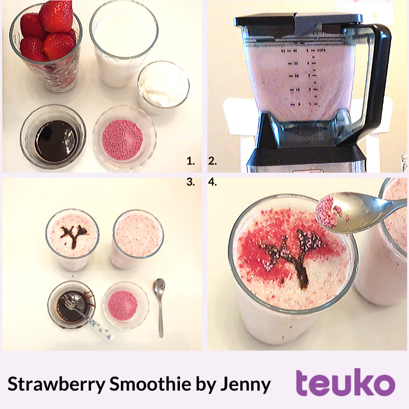 Strawberry smoothies bloom in Spring style with our Teuko friend Jenny. Jenny lives in Colorado, in the United States, but she is originally from South Korea. This mix of two cultures makes her cuisine so rich. Today, she is sharing with us a recipe for making unique strawberry smoothies. Four simple ingredients is all you need to make Spring blossom in your smoothies year-round!