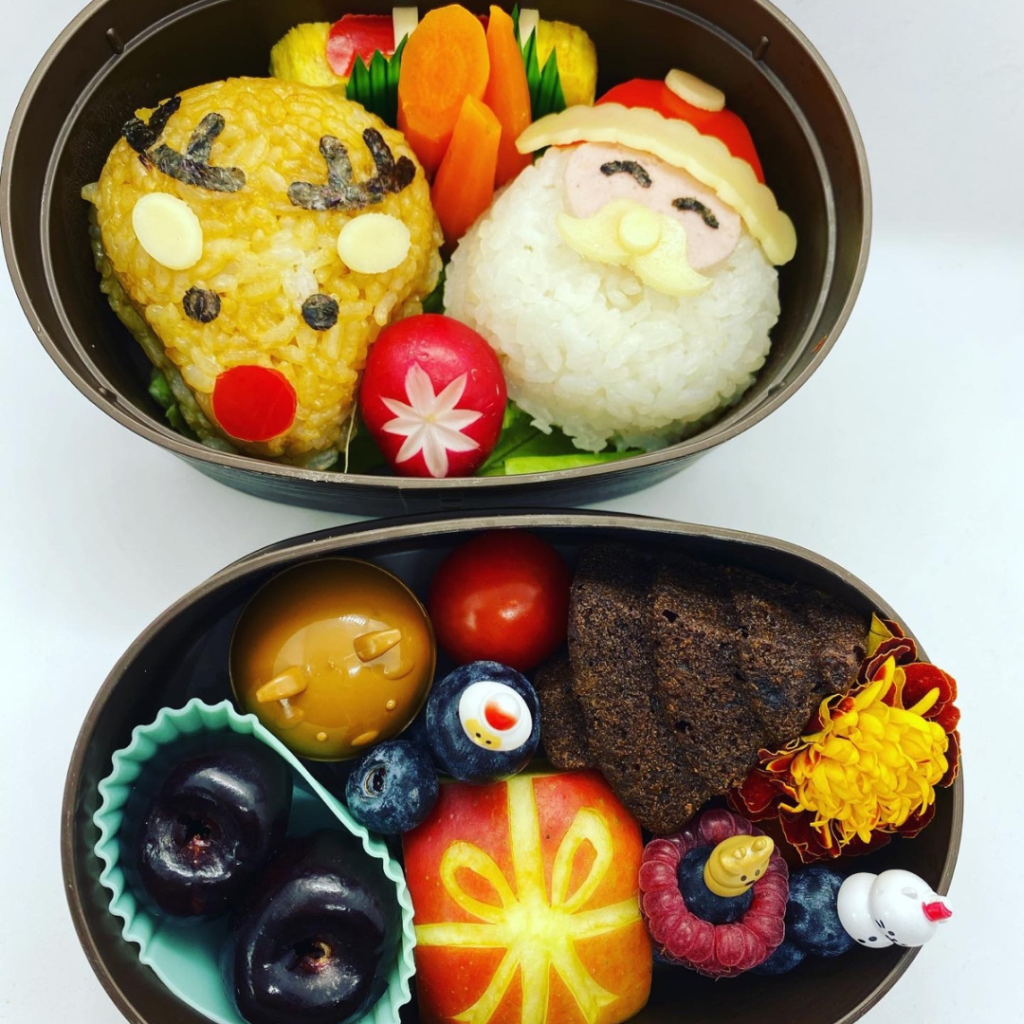 This is a beautiful Christmas bento lunchbox idea for kids by our Teuko Friend @silkes_bentoboxes. She molded a triangular, yet rounded, onigiri, with yellow/brown rice. On top of the onigiri, she added small pieces of seaweed for the antlers and for the eyes. She also added two tiny ears made out of cheese (it looks like Provolone cheese or white cheddar), And a round piece of red bell pepper, or cherry tomato, for making Rudolph’s nose.