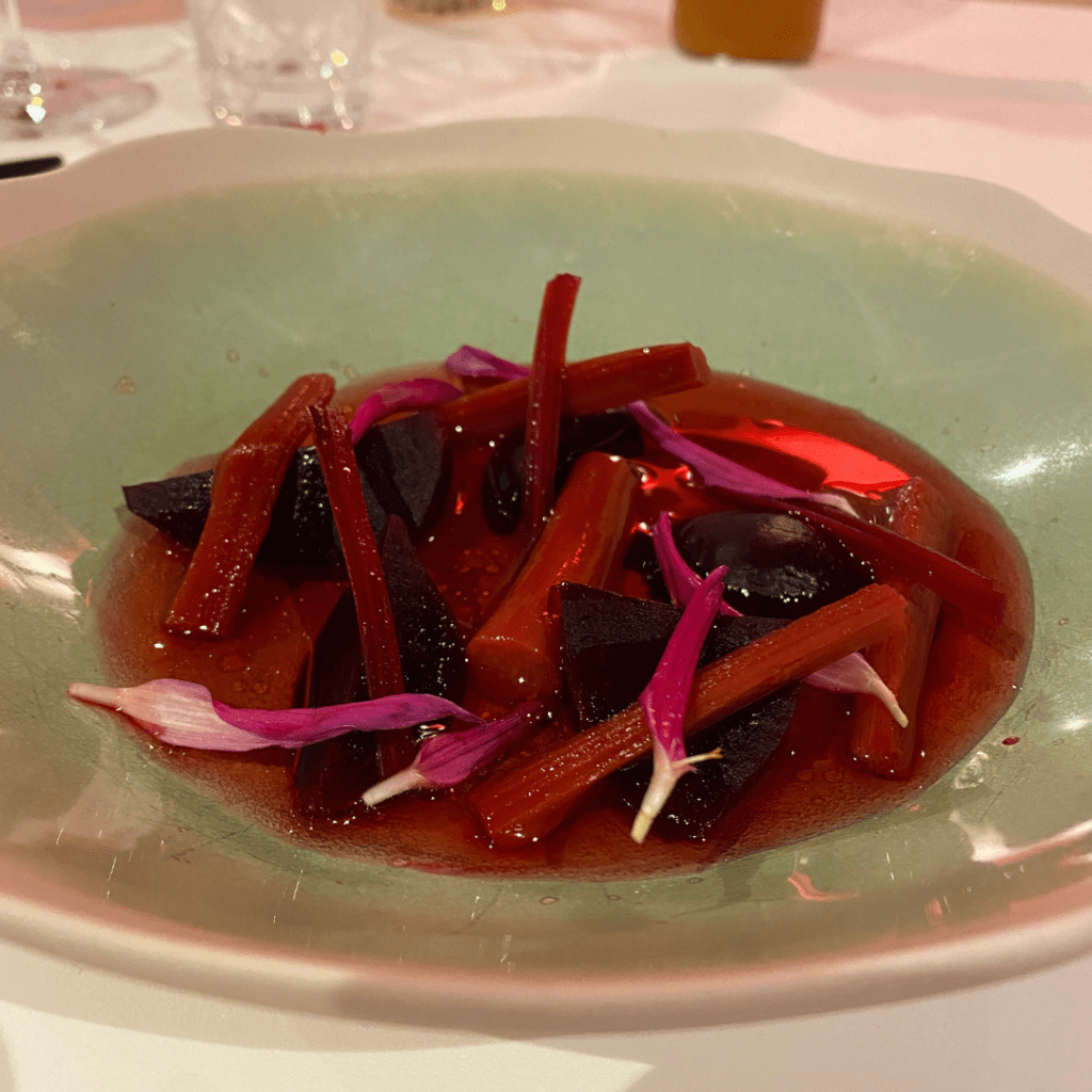 Young small beets paired with rhubarb that was infused in strawberry syrup and with edible dahlia flowers. Everything was presented in a delicious hibiscus-flavored kombucha.