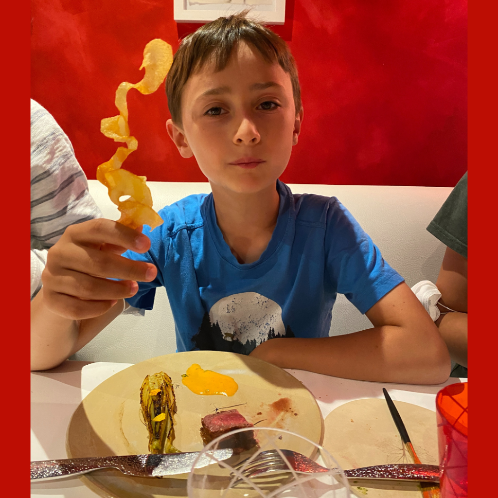 A delicious piece of beef (Boeuf de Salers), with a braised fennel, sauce choron (which is a sauce bearnaise with tomato), and long, curly, and crispy potato chips (that amused our youngest Teuko Kid!)