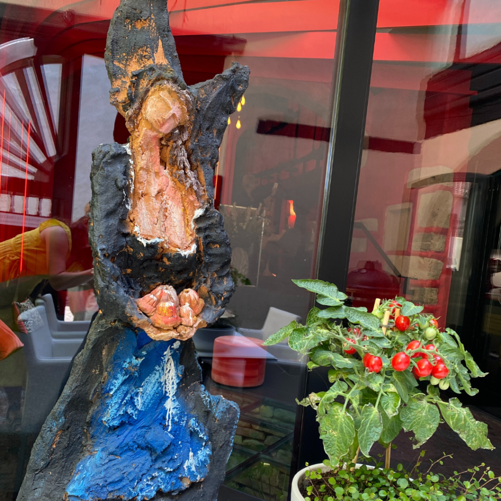 In the entrance, there was a wood sculpture representing an Alsacian in her traditional costume, with, in front of it, gorgeous red cherry tomatoes on their vine… We were all tempted to eat them! And, still at the entrance, as we turned slightly to our right, the glass door of the kitchen was open… imagine the delightful smell that was coming out of it! We could not wait any longer… we had to ask whether our family could have lunch at “La Table du Gourmet”!