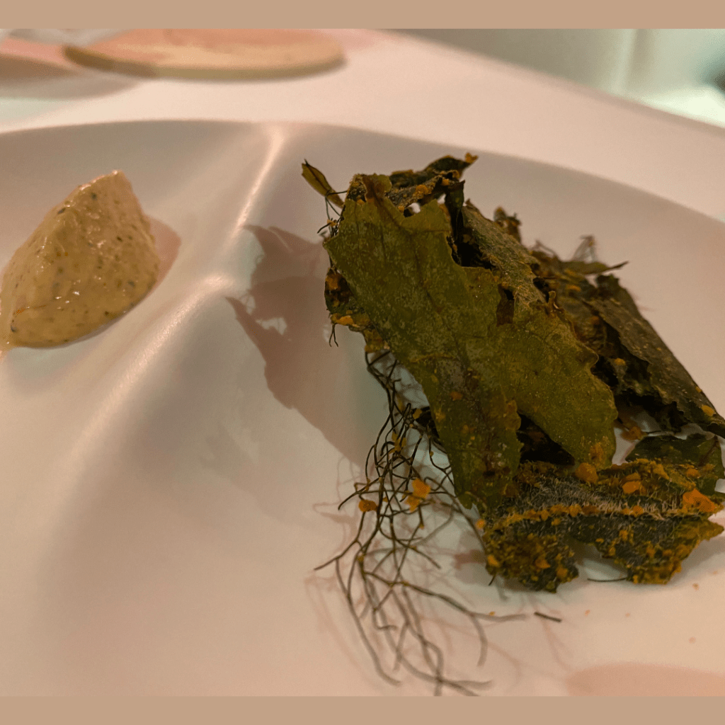 Dehydrated leaves of radish and dehydrated greens of fennel, with creamy mayonnaise. A crispy mini crepe filled with cream and a tiny piece of beet. Mushroom cappuccino.