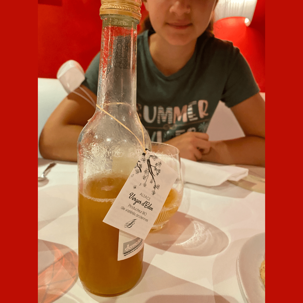 Adults had an amazing glass of Gewürztraminer, the white sparkling wine of the region, while the Teuko Kids had “the most tasteful” apple juice from a small producer in the region, “The Verger d’Eden”.